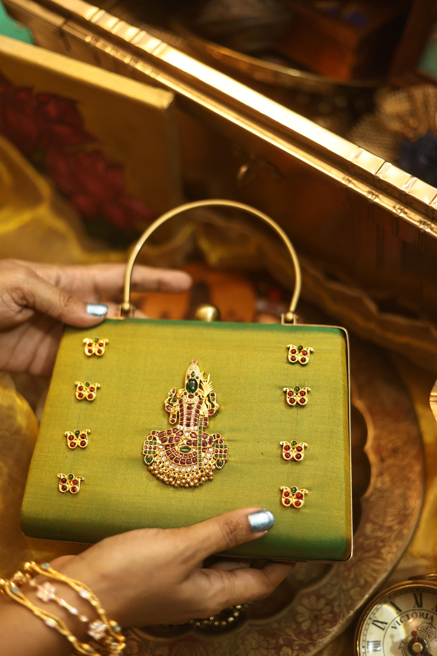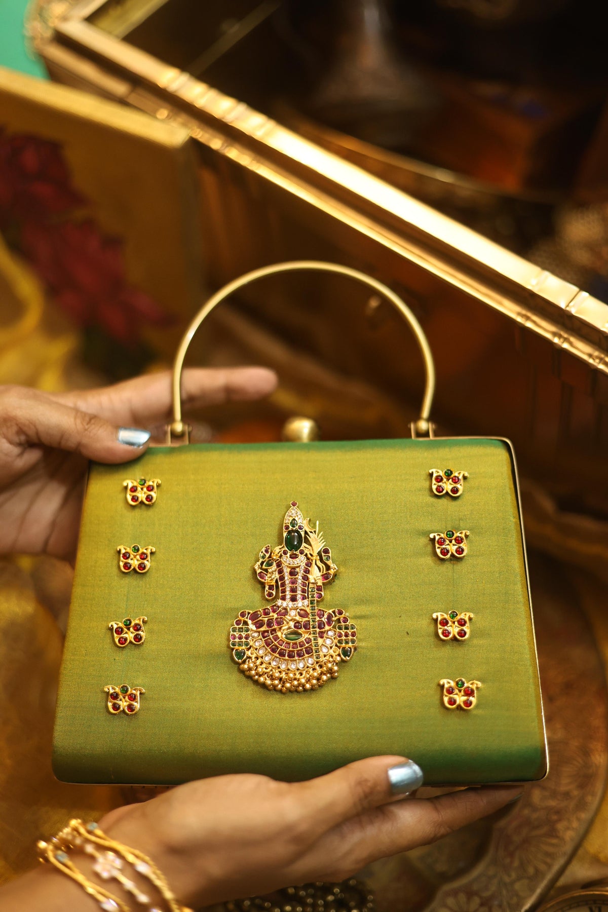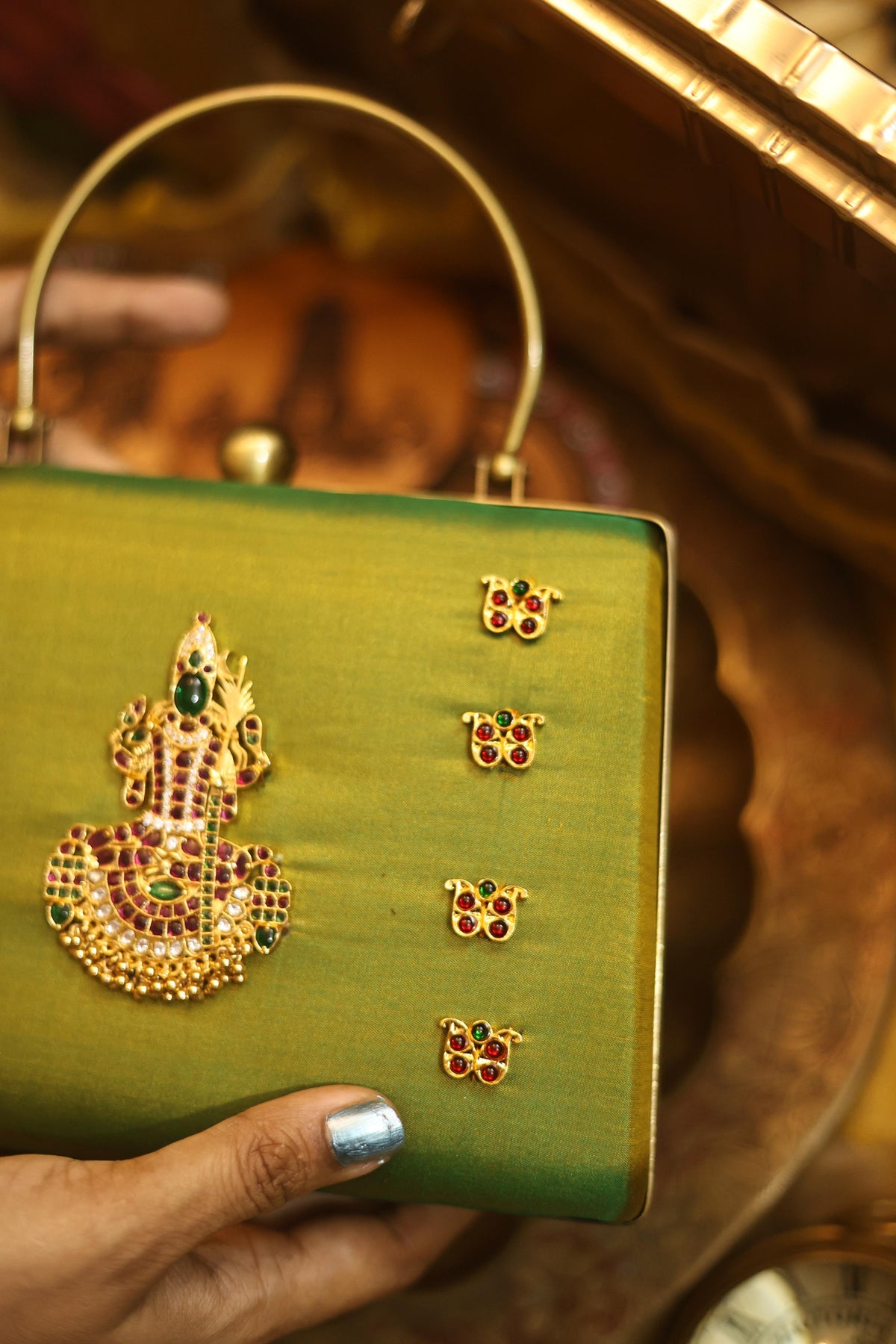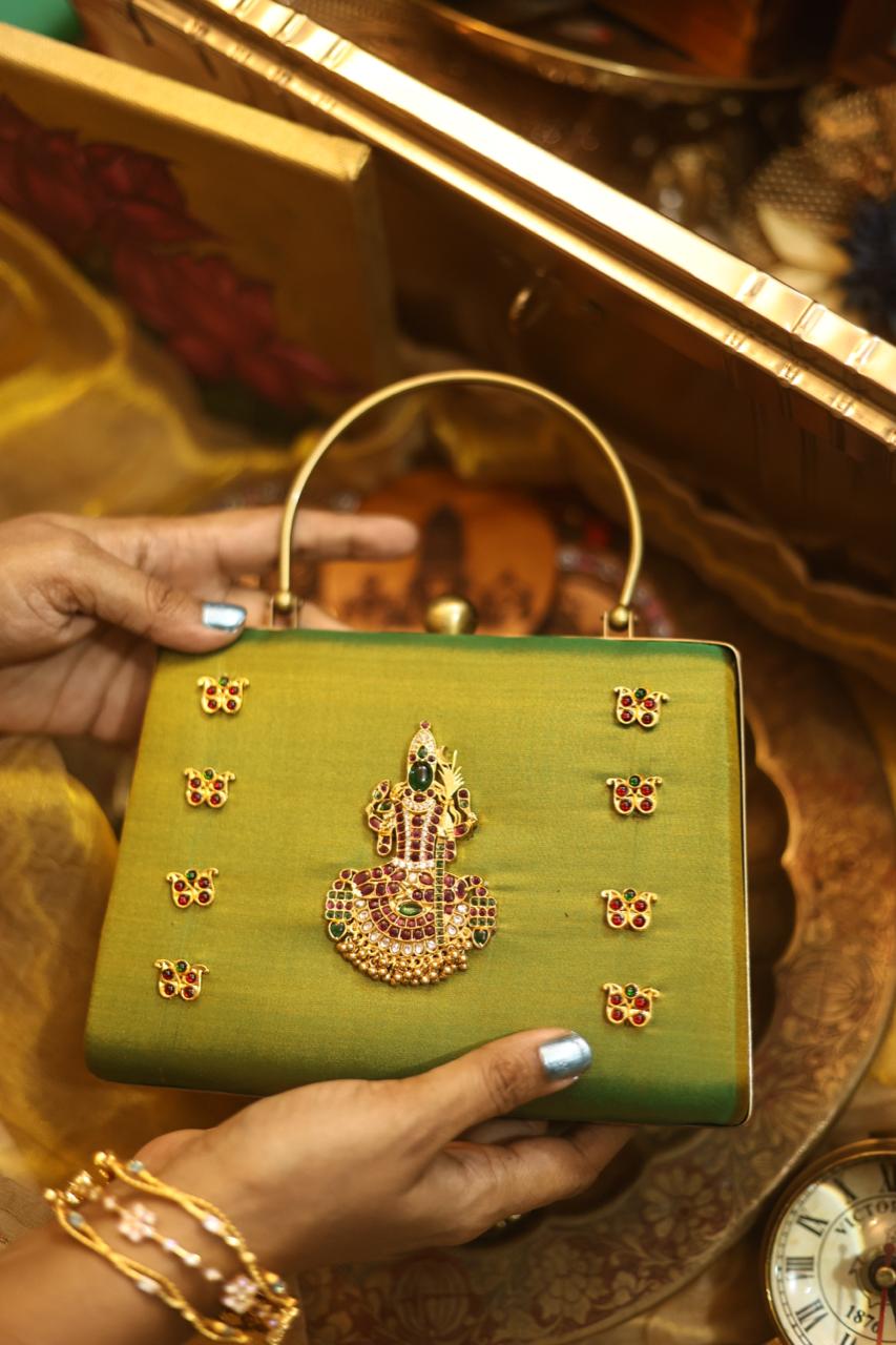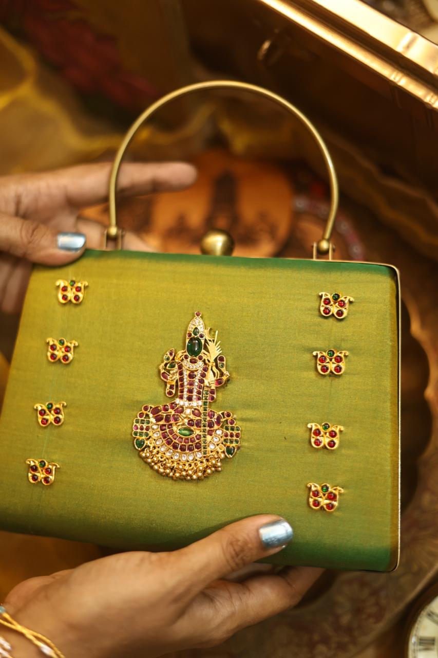 A statement piece from our Divine Series, inspired by traditional temple artistry. This elegant clutch features a beautifully detailed divine motif adorned with high-quality Kemp stones, bringing together heritage and craftsmanship.