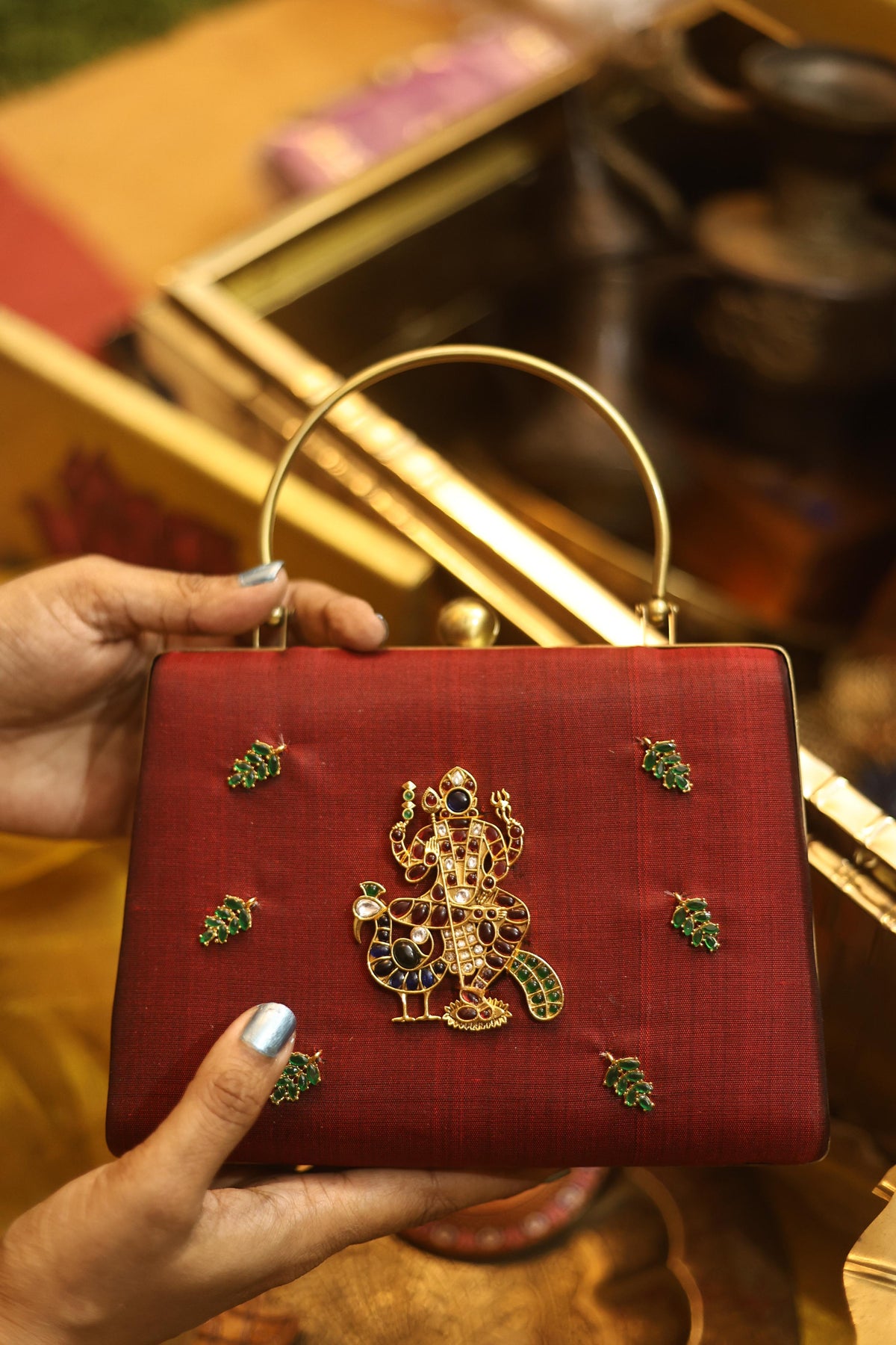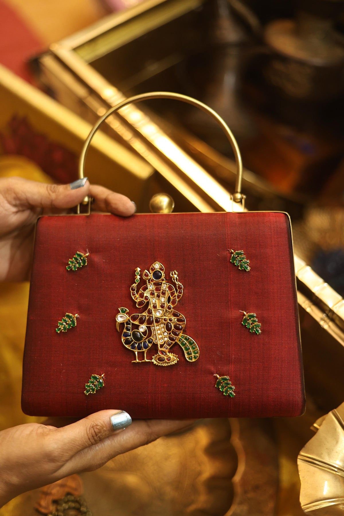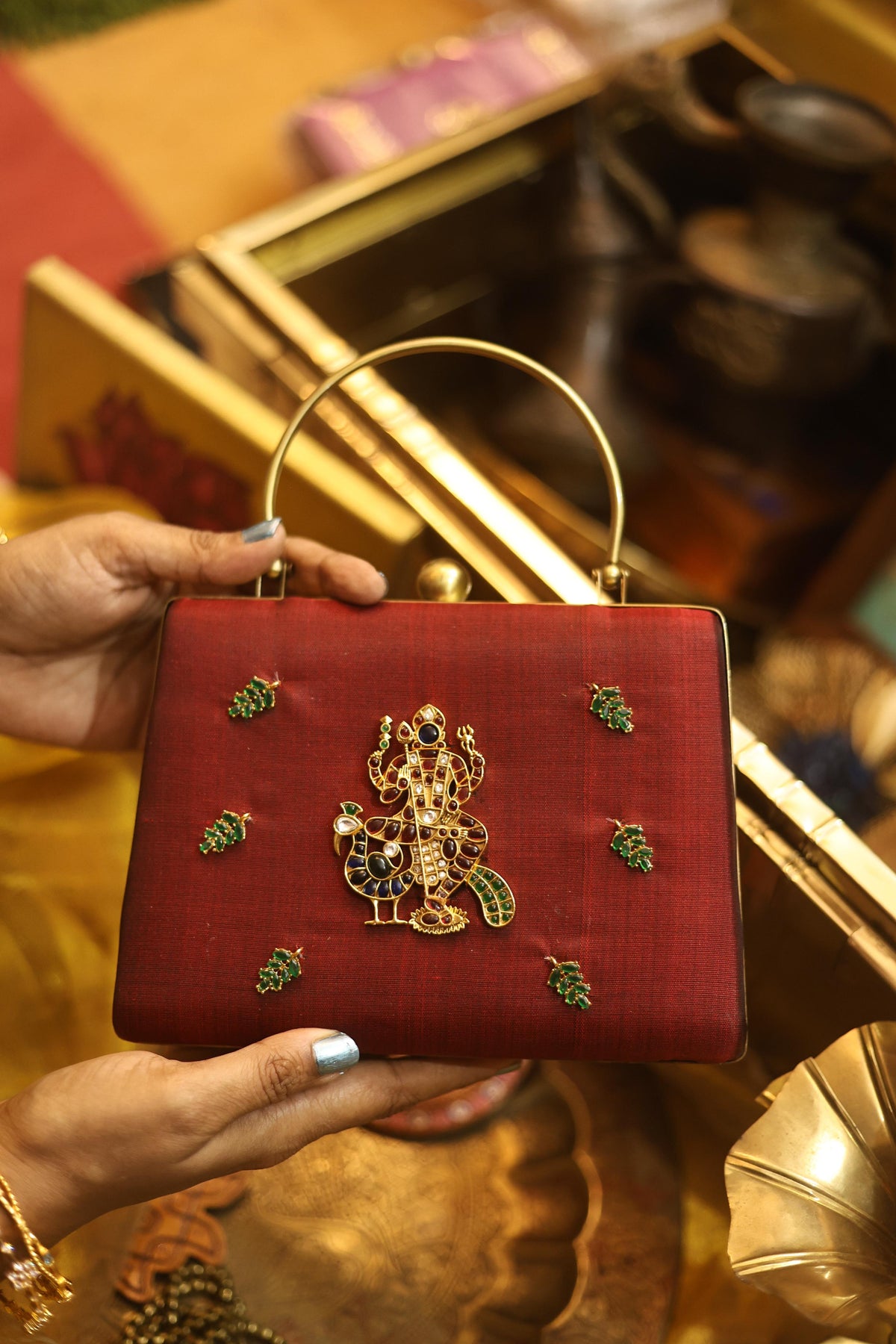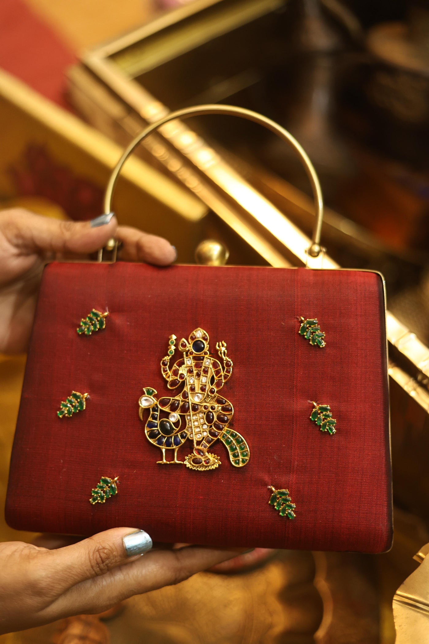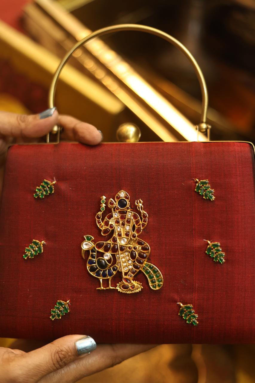 A statement piece from our Divine Series, inspired by traditional temple artistry. This elegant clutch features a beautifully detailed divine motif adorned with high-quality Kemp stones, bringing together heritage and craftsmanship.