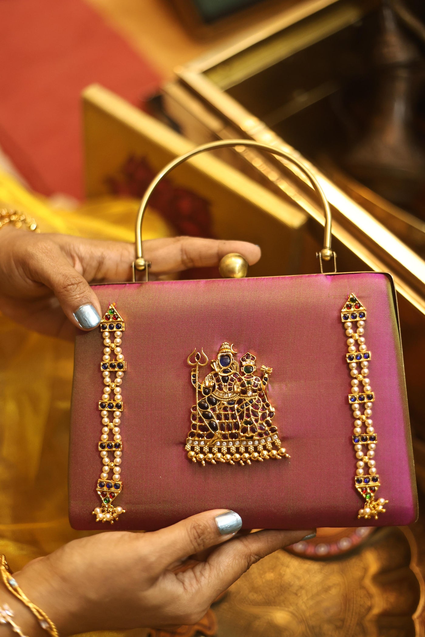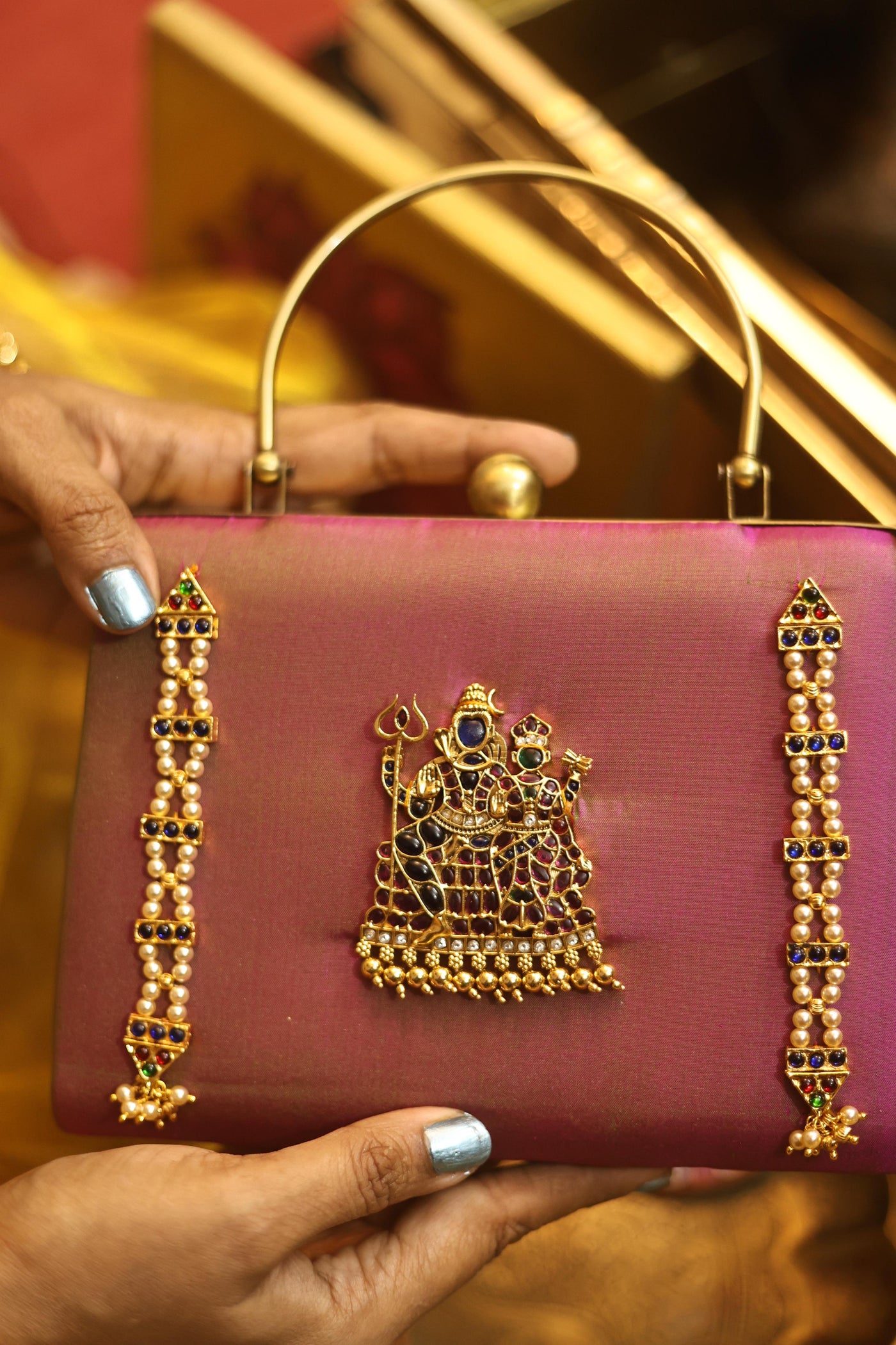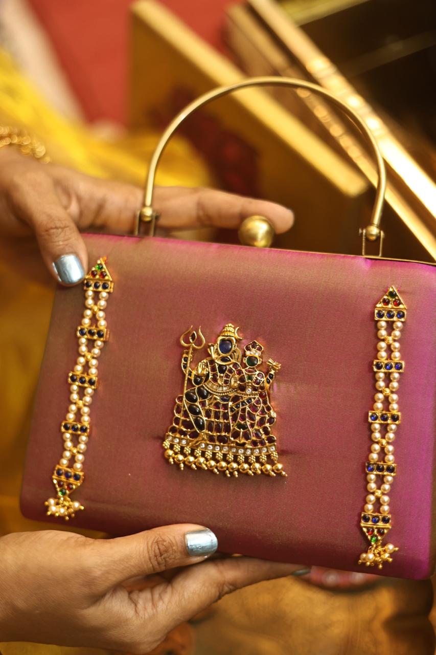 A statement piece from our Divine Series, inspired by traditional temple artistry. This elegant clutch features a beautifully detailed divine motif adorned with high-quality Kemp stones, bringing together heritage and craftsmanship.